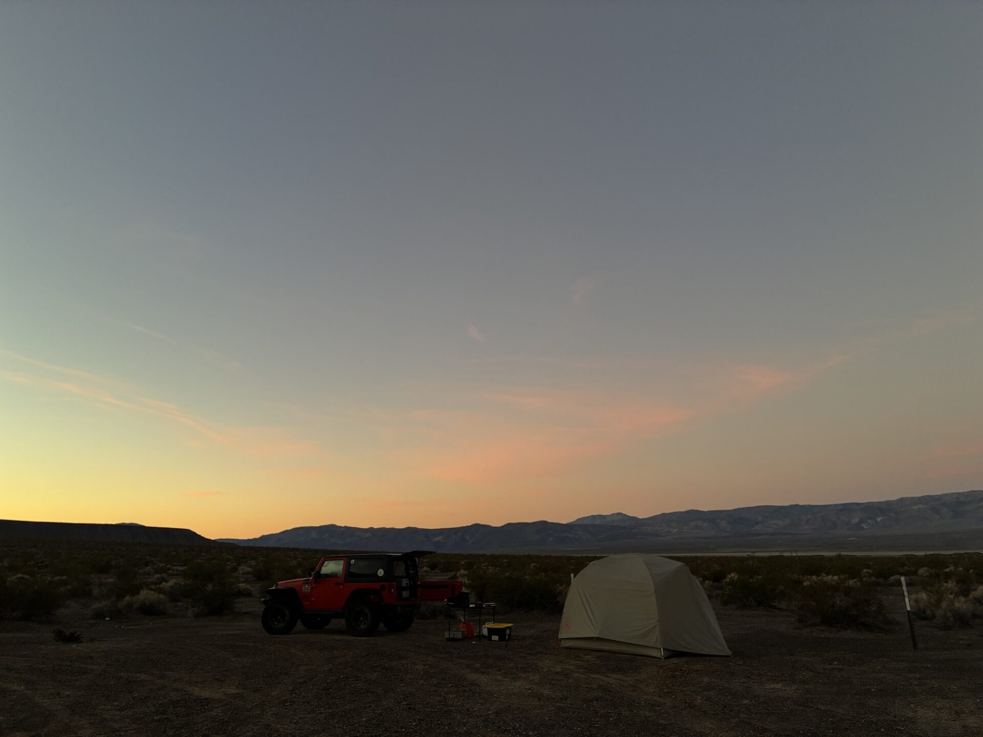 Danny, who was towing Annabelle with the Sprinter, left SB super early, and Jim and Fernando caught up just before Trona, where we refueled and got our traditional fried chicken from Chesters for lunch. Passing Ballarate we set up camp in our usual spot near the Surprise Canyon wilderness. The weather was perfect, low 70s on the valley floor, clear blue skies and absolutely no wind!