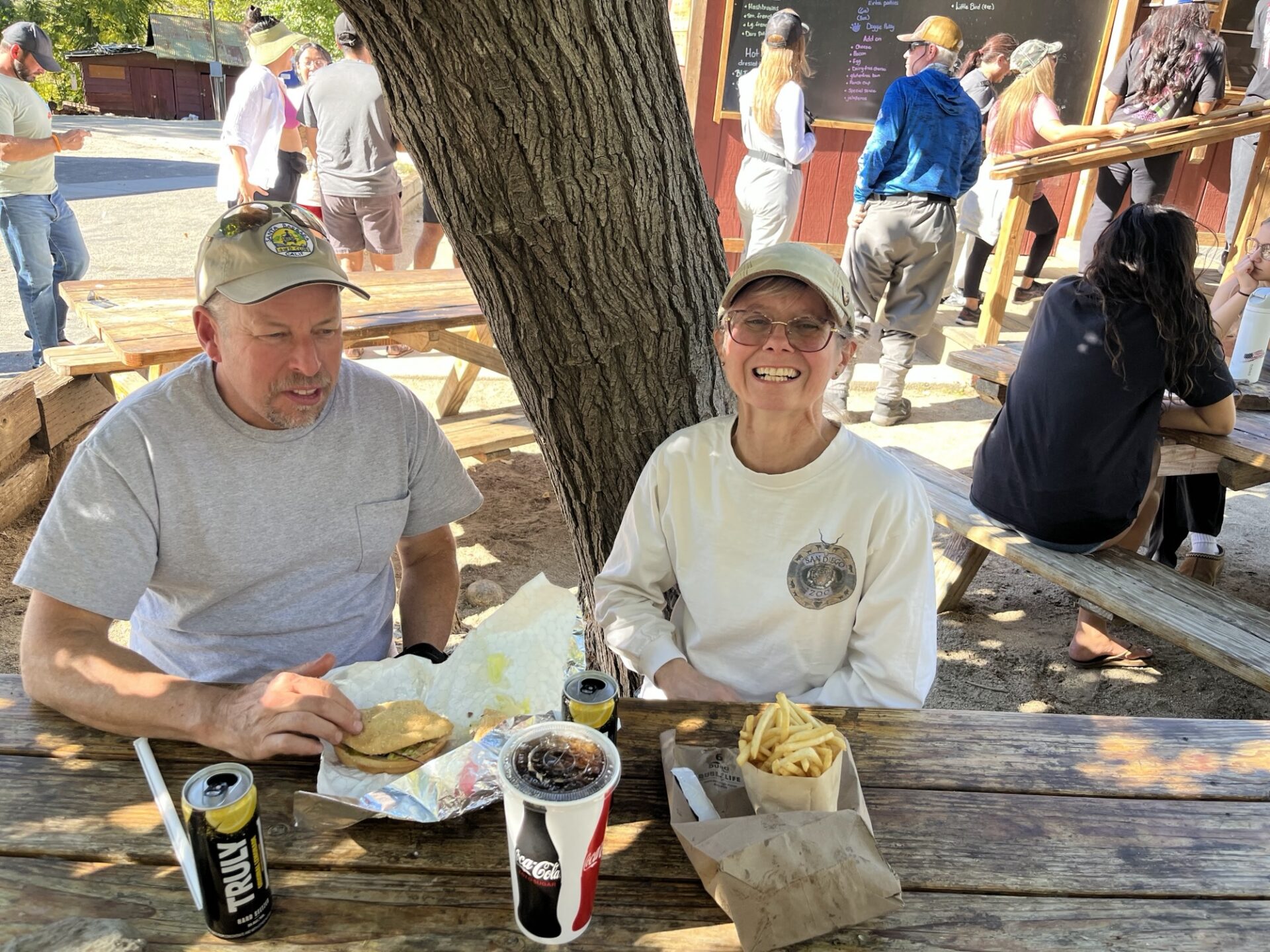 After a nice break, we traveled back down the mountain the same way we came up and eventually got back to asphalt, where we aired back up and headed back down the mountain. Some members stopped at the McNally’s burger shack for lunch, enjoying their tasty food at their picnic tables out front.
